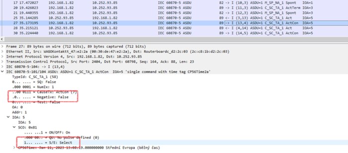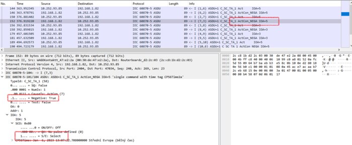 The last example is a bit more complicated, but it illustrates how useful the network communication dump is. The IEC 60870-5-104 protocol is used in the dispatching of power sources and appliances in the grid. The remote communication unit (RTU) was to receive a binary command with a time stamp, in the protocol this is the data type C_SC_TA_1. The dispatcher tried to command the unit repeatedly, but was unsuccessful - the unit at 192.168.1.82 always returned a negative response, so the command was not accepted: