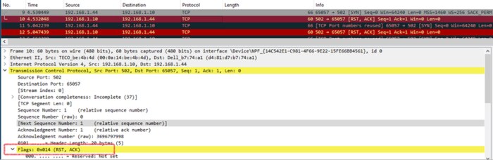 A response is returned from the destination address (here 192.168.1.10). However, an attempt to open a TCP connection to port 502 results in an error: a packet is returned (packet 12 in the listing, see the first column) with the attributes ACK (acknowledgement of receipt) and RST (connection termination), which means that the device is available on the IP address in the network, but no service is running on TCP port 502. Therefore, the Modbus TCP server is probably not enabled or configured on the target device.