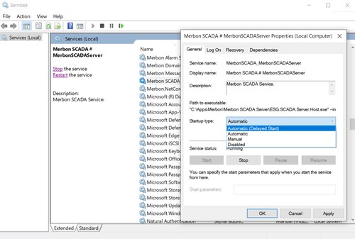 At some events, there was a problem with the automatic start of SCADA services when the PC is turned off and on. Normally, Windows starts services in the mode they were in when the PC was turned off. This problem is manifested by the fact that the Merbon SCADA server service is stopped when the PC is switched on, even though it was started before it was switched off.