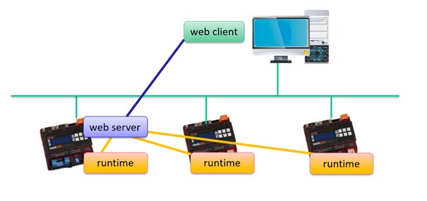 It is not necessary to browse more PLCs to get data from the entire network. Data from different PLCs are communicated to a common web server, which is running on a single PLC in the network. All values can be displayed together in one panel or trend, the security policy may be simplified, etc.