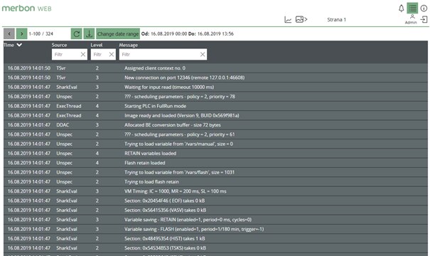 The web contains a generic page with system event records, such as PLC start, launching of processes, connection of users, etc. For diagnostics and service. All records can be downloaded as a .csv file.