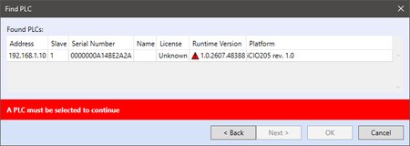 If a red triangle is displayed during PLC detection and the solution cannot be uploaded to the PLC - Error message "Target device contains old runtime, update is required"