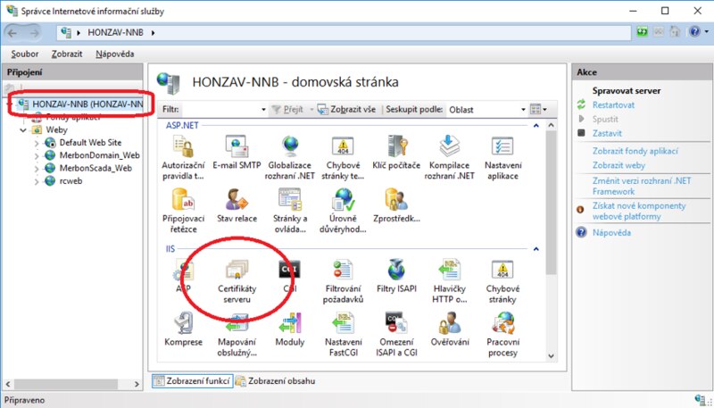 A certificate is a file with .pfx extension. There are also other certificate formats, however, the IIS server requires a .pfx file. The file is imported in the IIS server settings (Server certificates) and then selected in the MerbonScada_Web configuration (Bindings, Add…, Type: https to port 443, and select the certificate file which was imported in the previous step).