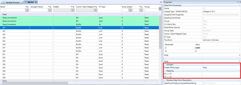 If it happens to you that the variables of the added device do not appear in the variable browser even after compilation, then you do not have mapped variables in the data points of the device. Either use Autogen for hardware data points (recommended), or create a global variables and map it to the I/O points in Mapping IO => ST for reading, and ST => IO for writing.